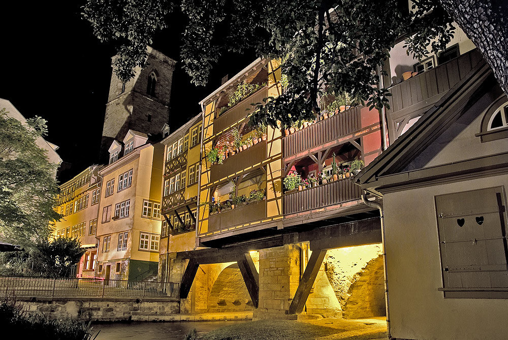 Krämerbrücke, in Europa längste mit 32 Häusern bebaute Brückenstraße mit vielen kleinen